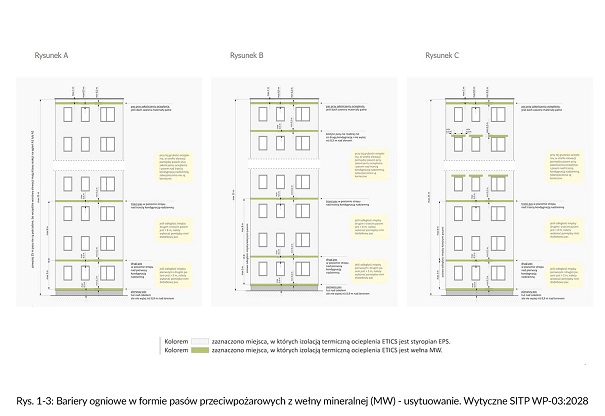 Rys. 1-3: Bariery ogniowe w formie pasów przeciwpożarowych z wełny mineralnej (MW) – usytuowanie. Wytyczne SITP WP-03:2028