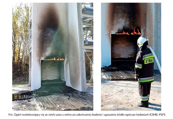 Fot. Ogień wydobywający się ze strefy pasa z wełny po zakończeniu badania i ugaszeniu źródła ognia po badaniach ICIMB. PSPS